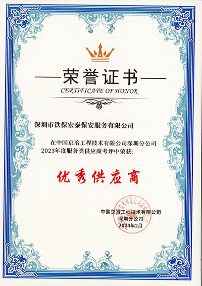 熱烈祝賀我司鐵保宏泰深圳保安服務公司在中國京冶工程技術有限公司深圳分公司榮獲2023年度服務類供應商考評中獲得“優秀供應商”稱號。