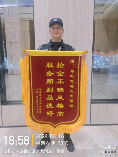 近日,鐵保宏泰深圳保安服務公司駐港之龍安保分隊隊員胡天國同志在園區巡邏,撿到一個錢包,內有身份證,駕駛證,多張銀行卡,現金1500元。馬上向客戶匯報。將錢包送往辦公室。等待失主認領!