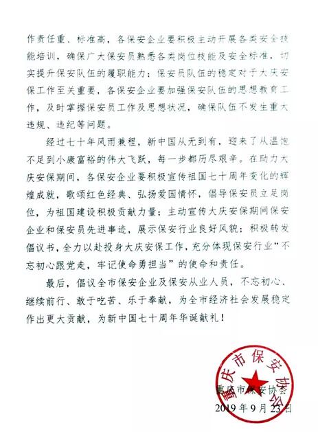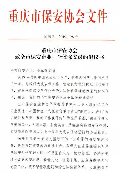 2019年9月23日,重慶市保安協會向全市保安企業、全體保安員發出倡議書,倡議全市保安企業及保安從業人員,不忘初繼續前行、敢于吃苦、樂于奉獻,為全市經濟社會發展穩定作出更大貢獻,為新中國七十周年華誕獻禮!